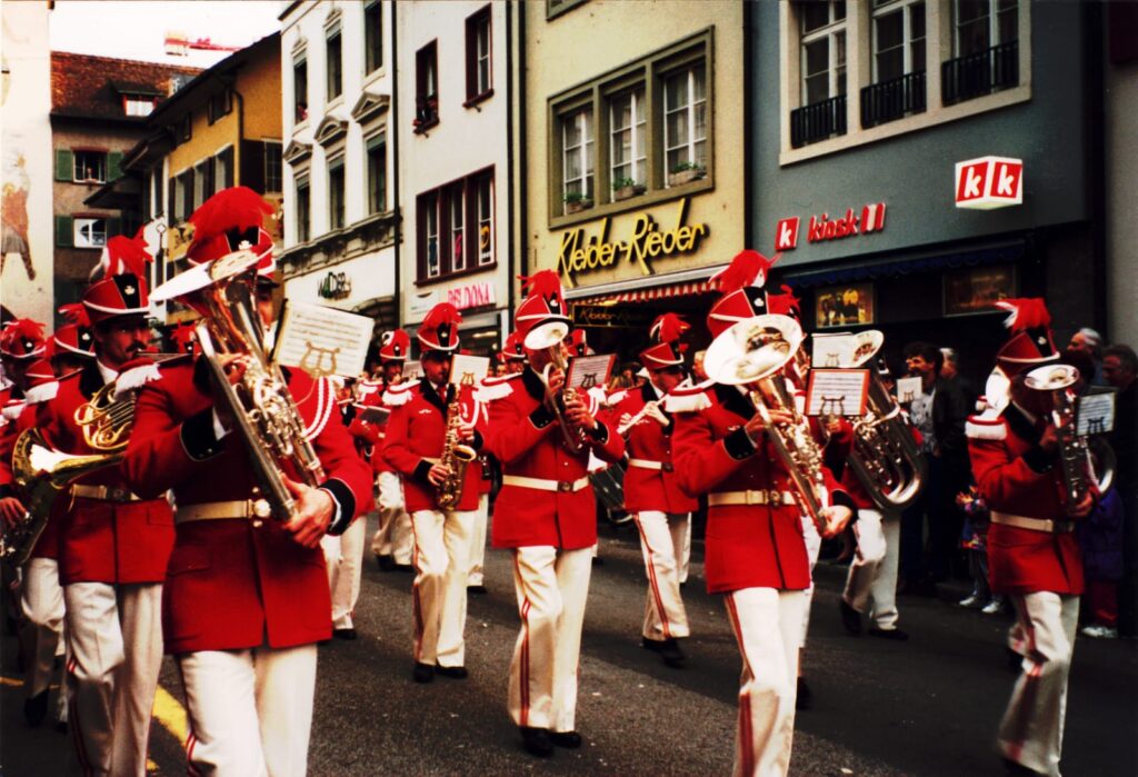 Insgesamt fünf Mal organisierte der Baselbieter Musikverband in den 90er Jahren im Liestaler Stedtli eine Marschmusikparade. An einem Freitagabend marschierten um die 20 Vereine im drei Minuten Takt das Stedtli hinunter und beglückten die zahlreichen Zuschauer:innen mit einstudierten Stücken im 2/4 Takt. Im Anschluss an die Parade liessen die Musikant:innen und Zuschauer:innen den Abend auf