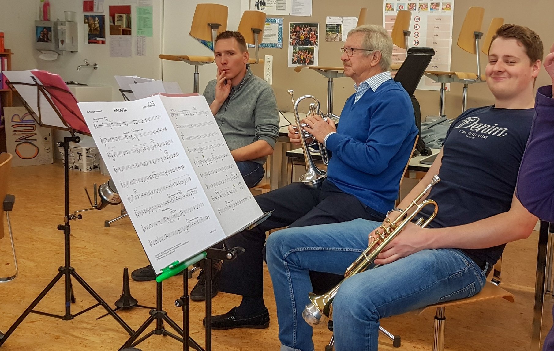 Nach der Ankunft im Probelokal und den ersten paar Aufwärmübungen sind dann auch die grummeligen Gesichter weg. Konzentriert üben wir komplizierte Rhythmen, schnelle Tempi und feilen an unserer Intonation. Die Stücke nehmen langsam Form an und klingen tatsächlich nach Musik. Die Vorfreude auf unser Konzert steigt.