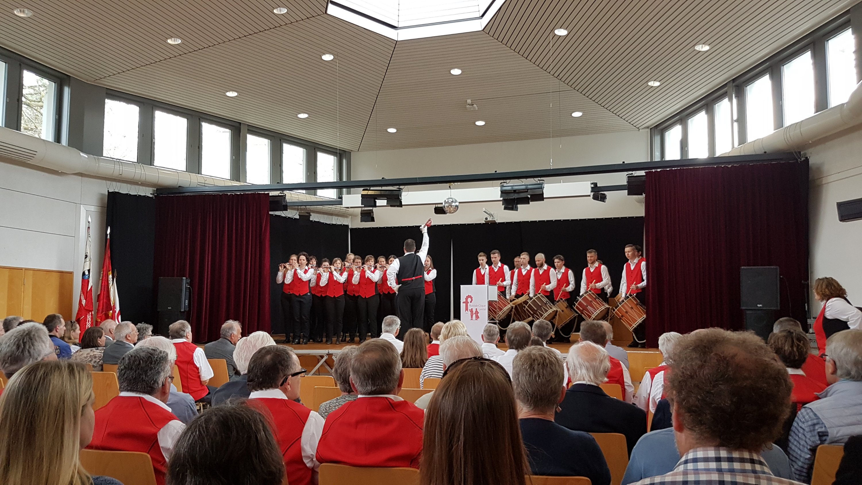 Die Stadtmusik Liestal ist mit einer Kleinformation an der Fahnenweihe der Rotstab Clique in der Aula Burg:
