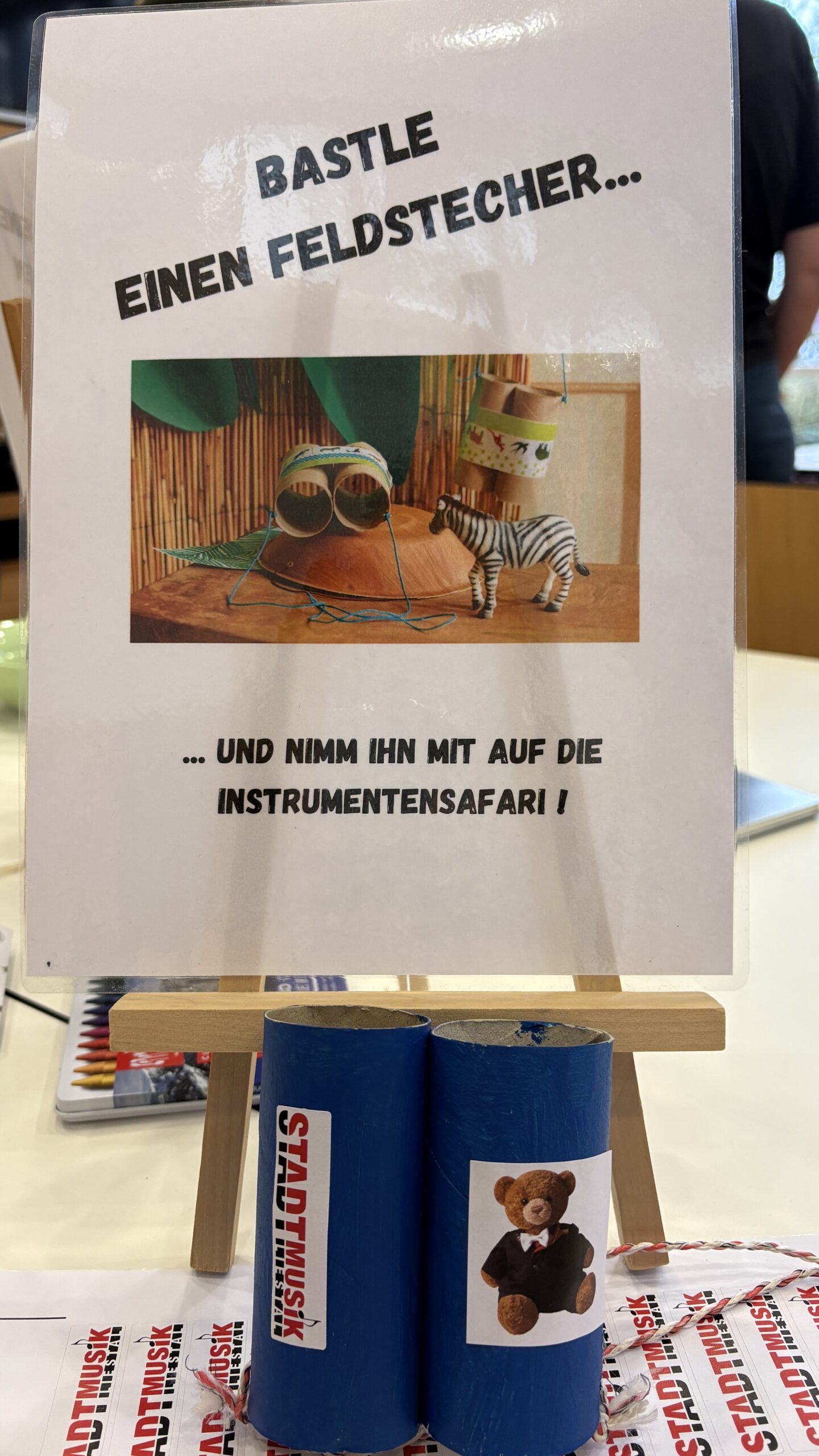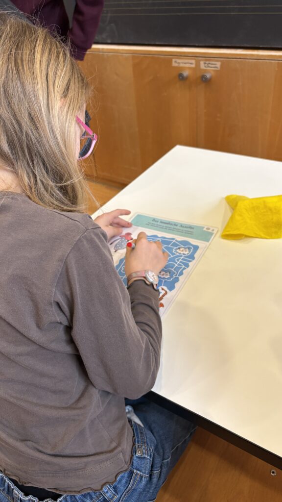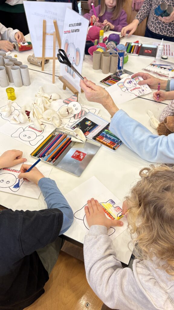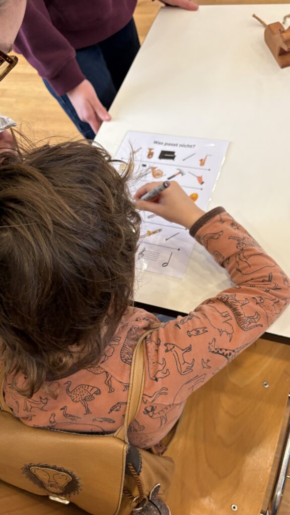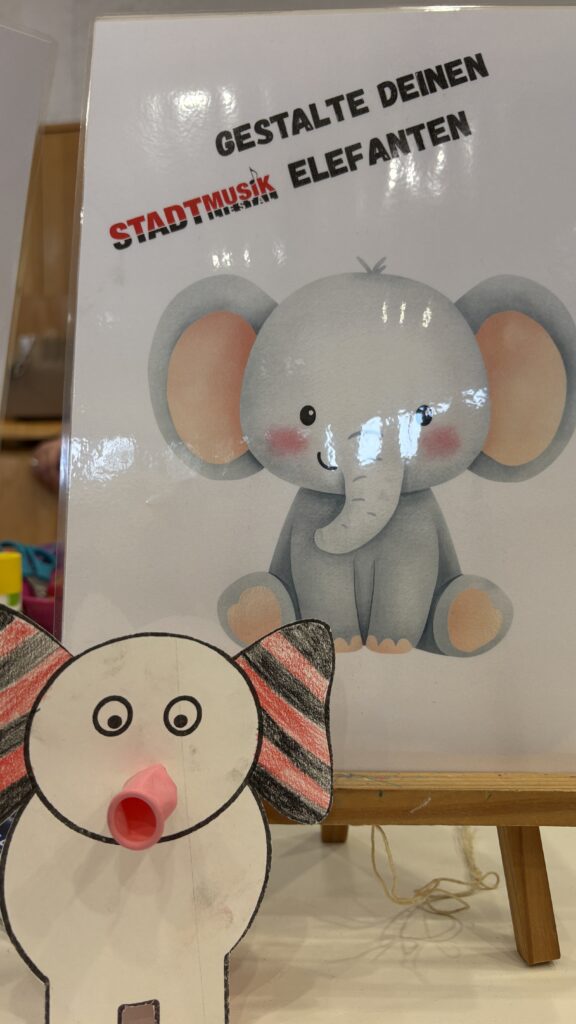 Am Anfang habe ich geschaut, was es alles gibt. Man konnte einen Feldstecher basteln und einen Elefanten anmalen. Ich habe nur den Elefanten angemalt. Ich habe noch drei Fehlersuchbilder gelöst. Musik gehört habe ich auch noch. Ich habe auch noch ein Rätsel gelöst, bei dem ich den Weg durch ein Labyrinth suchen musste. Am Ende war ein Saxofon. Ich habe viele Stadtmusik Gummibärchen und Schöggeli gegessen. Sirup habe ich auch getrunken.