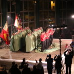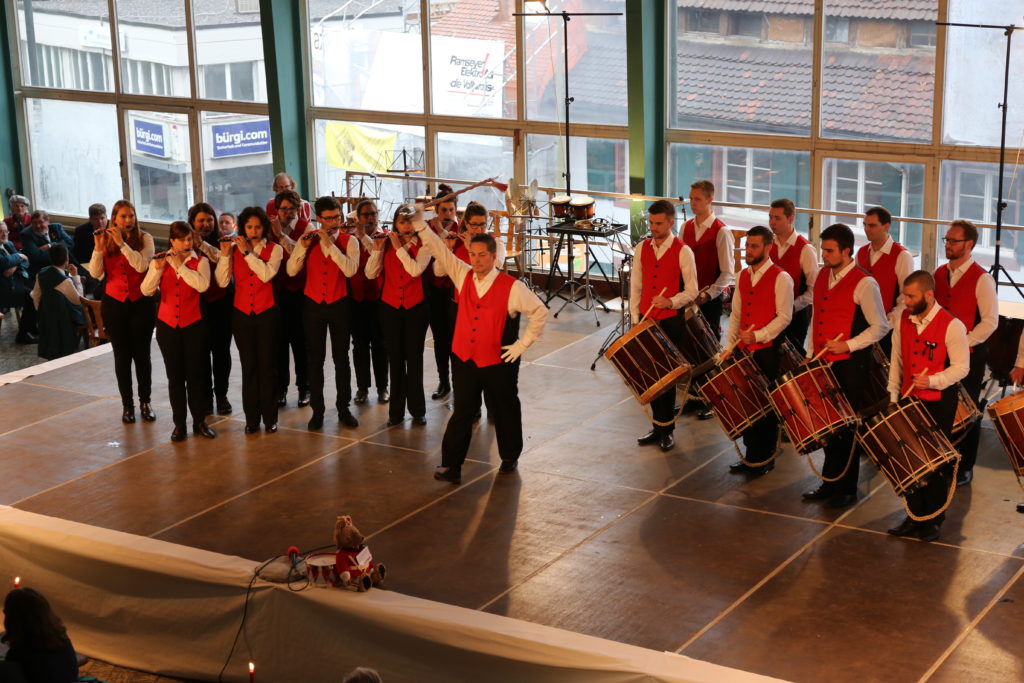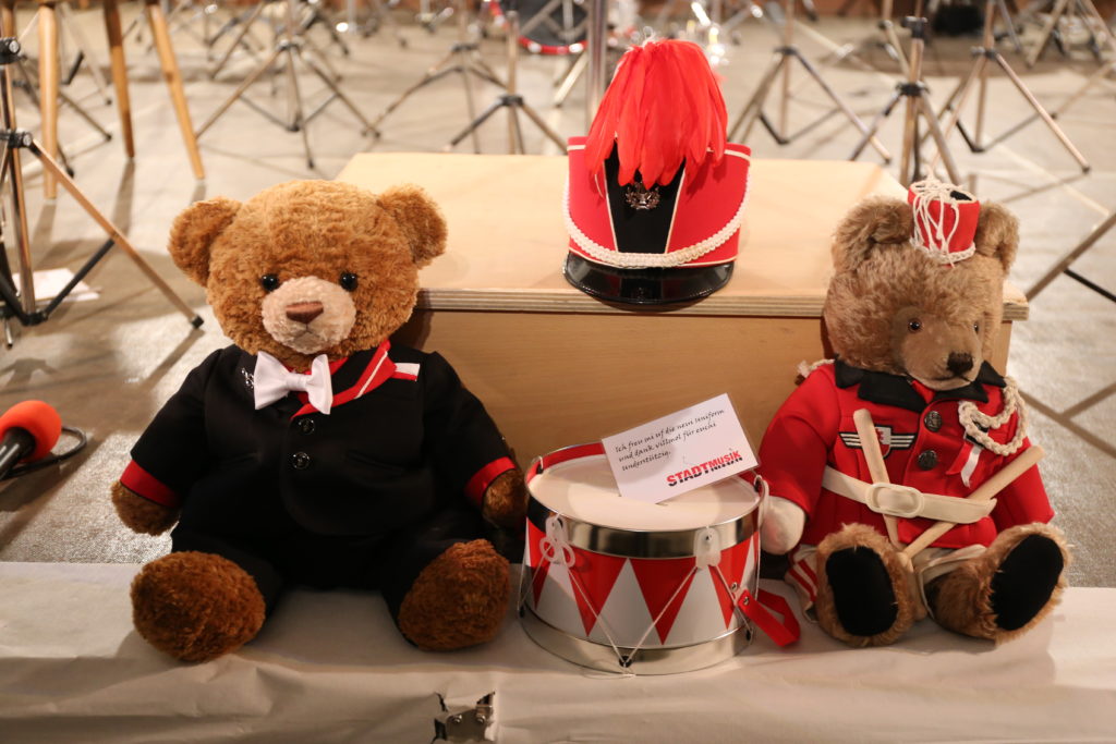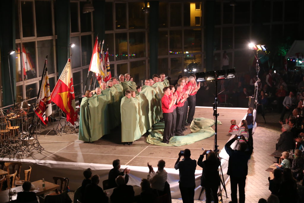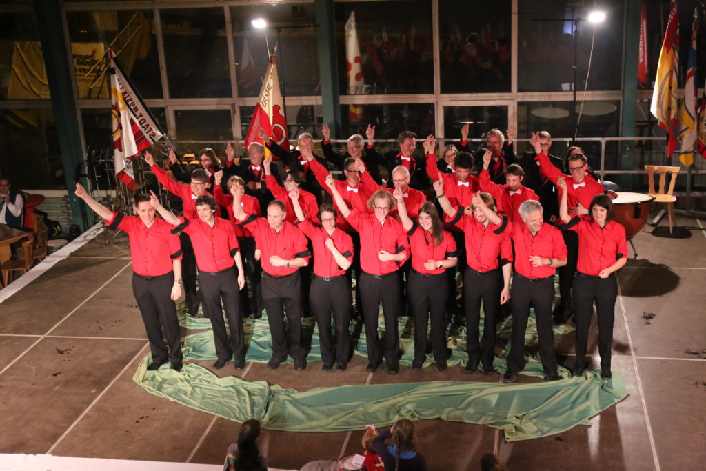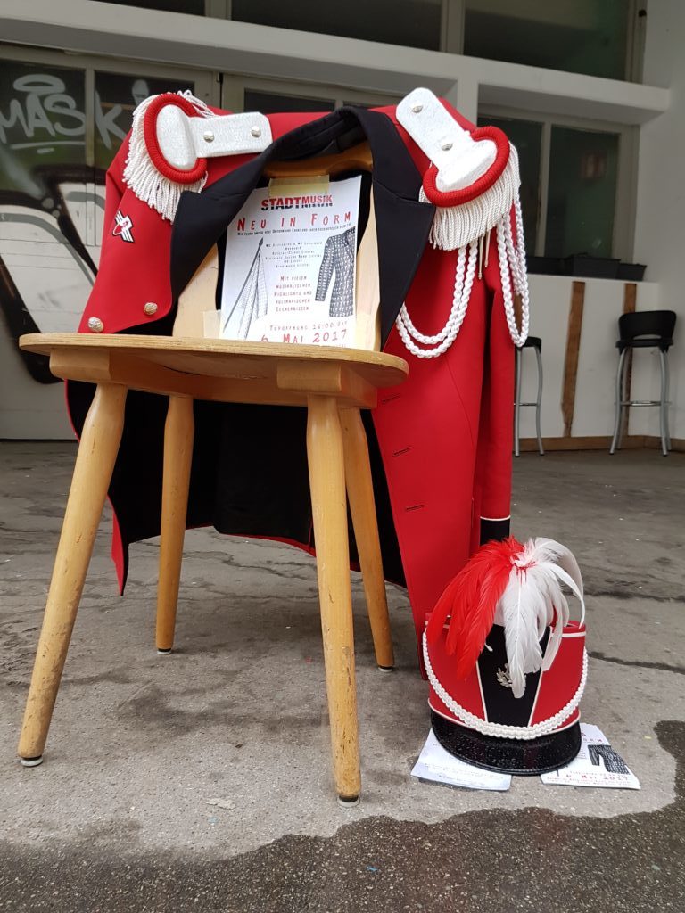 Die Enthüllung des neuen Gewands der Stadtmusik startete mit der Fahnenweihe. Das neue Design, welches einen Violinschlüssel mit dem Bischofsstab des Stadtwappens vereinigt und darunter das Törli zeigt, wurde von den Fahnengöttis Alex Vogt und Hans-Ruedi Schäfer präsentiert. Die grösste Neugierde galt jedoch der neuen Uniform und so war der Applaus gross, als sich die Musikanten und Musikantinnen, verhüllt in grünen Tüchern, auf die Bühne begaben. Darunter verbarg sich das grosse Geheimnis des Abends. Als die Tücher fielen, kam eine moderne, elegante und vielseitige Uniform, in Schwarz mit roten und weissen Details, einem roten Hemd und einer weissen Fliege zum Vorschein.