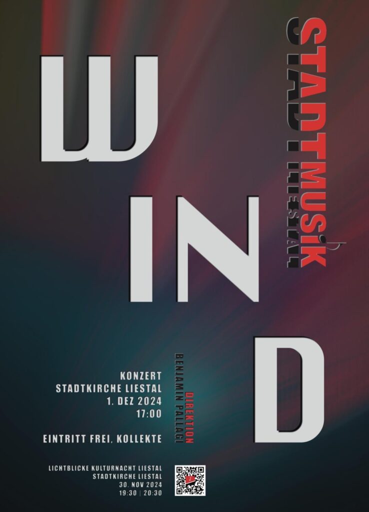 Am 1. Advent lädt die Stadtmusik Liestal zu ihrem alljährlichen Konzert in der Stadtkirche ein. In diesem Jahr gestaltet die Stadtmusik Liestal das Programm zum Thema «Wind». Ob leichte Bise oder starke Sturmböe, seien sie gespannt, wie dieses Thema musikalisch umgesetzt wird. Am Sonntag, 1. Dezember 2024,um 17 Uhr in der Stadtkirche Liestal. Wer dann