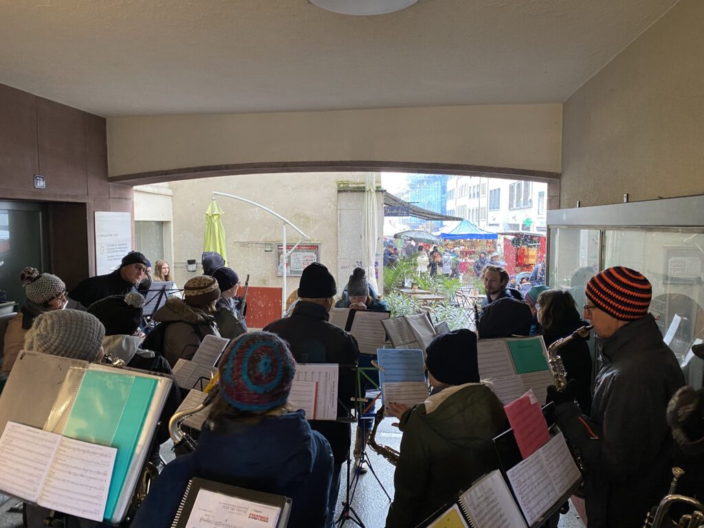 Gestern spielten wir am Weihnachtsmarkt in Liestal und brachten die Besucherinnen und Besucher in vorweihnachtliche Stimmung. Heuer forderte uns nicht nur die Kälte heraus, sondern auch der anhaltende Schneefall. Da wir unsere Holzblasinstrumente nicht mehr als nötig der Nässe aussetzen wollten, haben wir möglichst trockene Spielorte bevorzugt – leider  waren diese etwas eng. Zwischen den